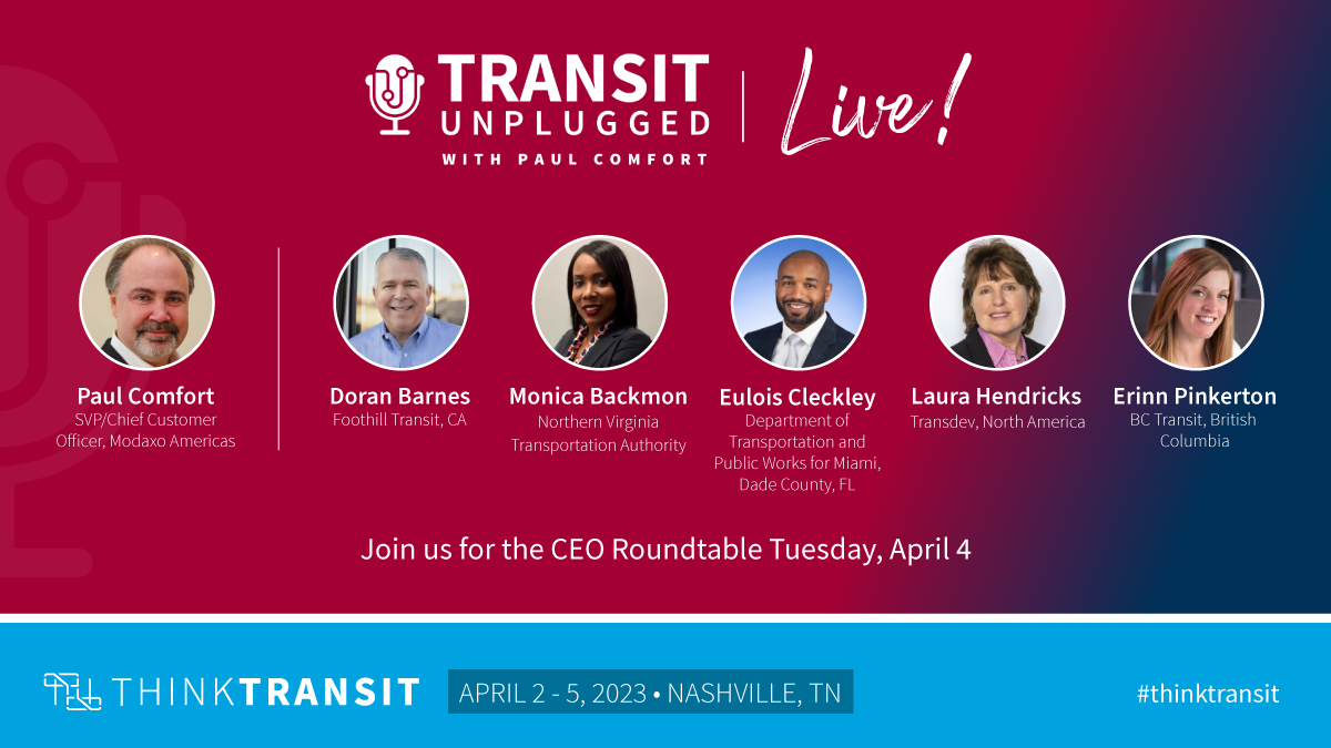 Our favorite podcast host and transit evangelist, Paul Comfort, is bringing Transit Unplugged LIVE to #ThinkTransit! Join us on Tuesday, April 4th, for the CEO Roundtable and hear from:🎙Erinn Pinkerton, BC Transit🎙Doran Barnes, Foothill Transit🎙Laura Hendricks, Transdev U.S.🎙Monica Backmon, Northern Virginia Transportation Authority🎙Eulois Cleckley, Department of Transportation and Public Works for Miami-Dade CountyThere's still time to register for #ThinkTransit!